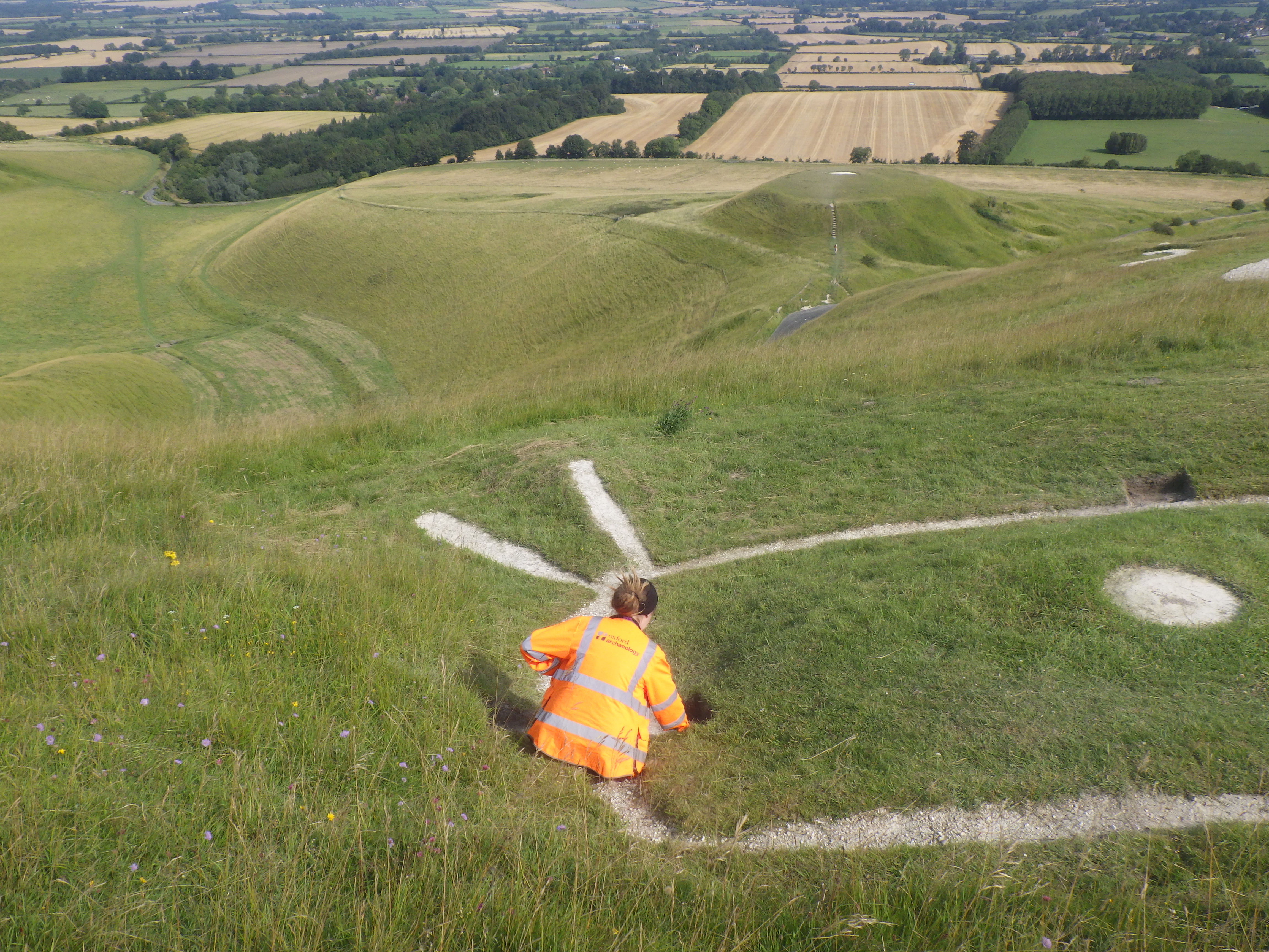 In 2023 we outlined and submitted proposals to Historic England to undertake preliminary investigations: a) to remove the turf and topsoil soil from around parts of the Horse to ‘ground test’ the results of the survey and b) to establish how much of earlier extents of the Horse were visible immediately beneath the turf. We knew from the 1990s investigations that below the modern topsoil the stratigraphic layering of earlier rammed chalk and eroded chalk-wash were complex and therefore not to be disturbed lightly. We decided to initially target the head and neck where those more significant changes could be seen. A team of volunteers and support from OA and the NT set to work.