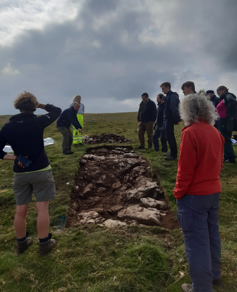 Results of the first days Photogrammetry: on Day one we flew the enclosure with a drone in order to get an idea of its characteristics. We now have the results back and it looks very interesting. It is now apparent that the reason for its unusual shape is that the enclosure is butted out from a curved wall that extended out from our primary coaxial wall. Firstly this means that this is genuinely a part of the primary field system and not a later addition, as had previously been suspected. Secondly we can see that there are two parallel walls extending north-east out from the enclosure, which had previously not been seen. The survey is showing that the site is far more complex with more phases of construction, than had previously been thought. This would indicate that it may have been in use for an extended period. Hopefully further drone surveys will continue to highlight new aspects of the site.
