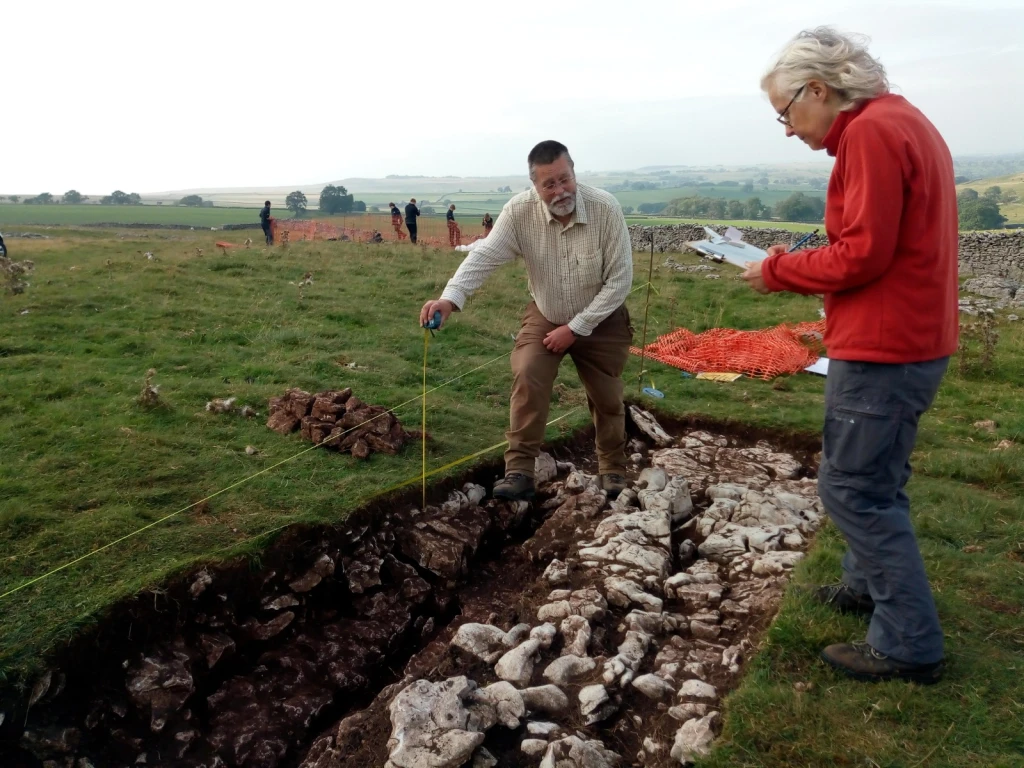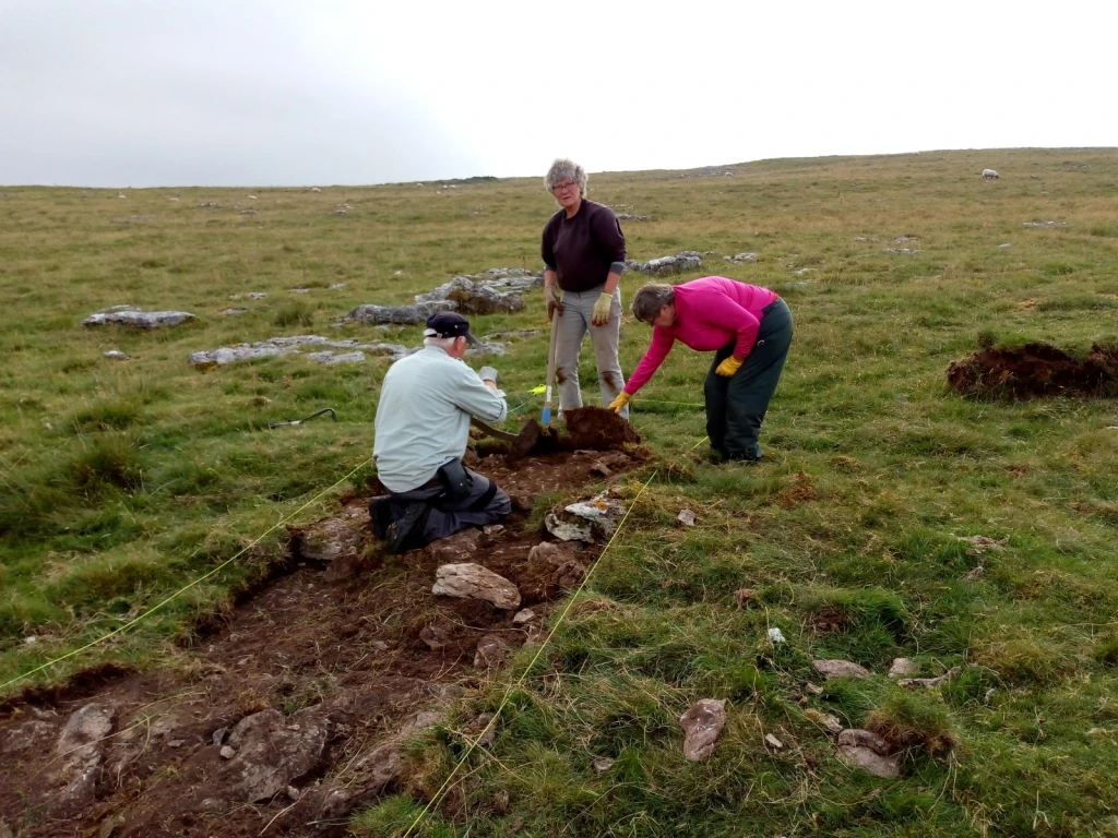 Meanwhile over in trench 1 Ian and Sue had been busy finishing the excavation of the enclosure bank and begun the task of recording with some fine section drawing. Although not as substantial as its initial appearance the excavation confirmed the banks construction from a mixture of soil and small to medium sized stones, apparently over the limestone pavement. The steeper internal side of the bank appears to have been exaggerated by the erosion of the interior soils, giving the impression of a larger bank than currently survives in this location.