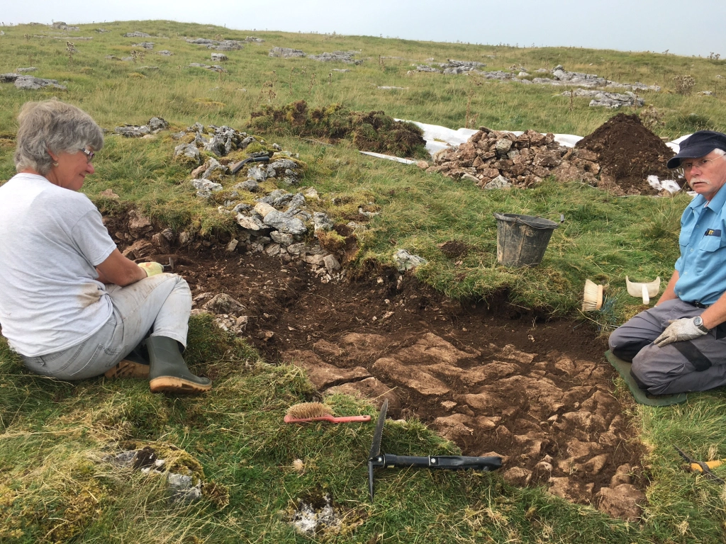 We opened two new trenches this morning which were a fair old trek from where we started, we are now working on higher ground with even better views! The newly opened trenches 5 and 6 were quite the task to de-turf; thanks to Jan, Ian, Bob and Phil for persevering and getting us down to the good stuff underneath. Trench 5 is targeting a small roundhouse which is visible in the landscape due to an upstanding ring of stones and turf. After taking off the topsoil Jan and Bob cleaned down to find the remnants of a 'wall' with limestone pavement on the exterior.
