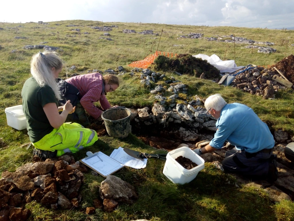 Cecilia returned today and stepped in to trench 5 to give Bob some help. Yesterday’s excavations at the round house had exposed what appeared to be a soil and rubble core at the heart of the wall and today’s efforts demonstrated that the wall footing had been built directly on to the limestone pavement. Following its disuse the outer face of the wall appears to have collapsed downslope, leaving a scattering of rubble and soil over the limestone pavement. The decision was made to widen the trench slightly to expose more of the wall in plan.