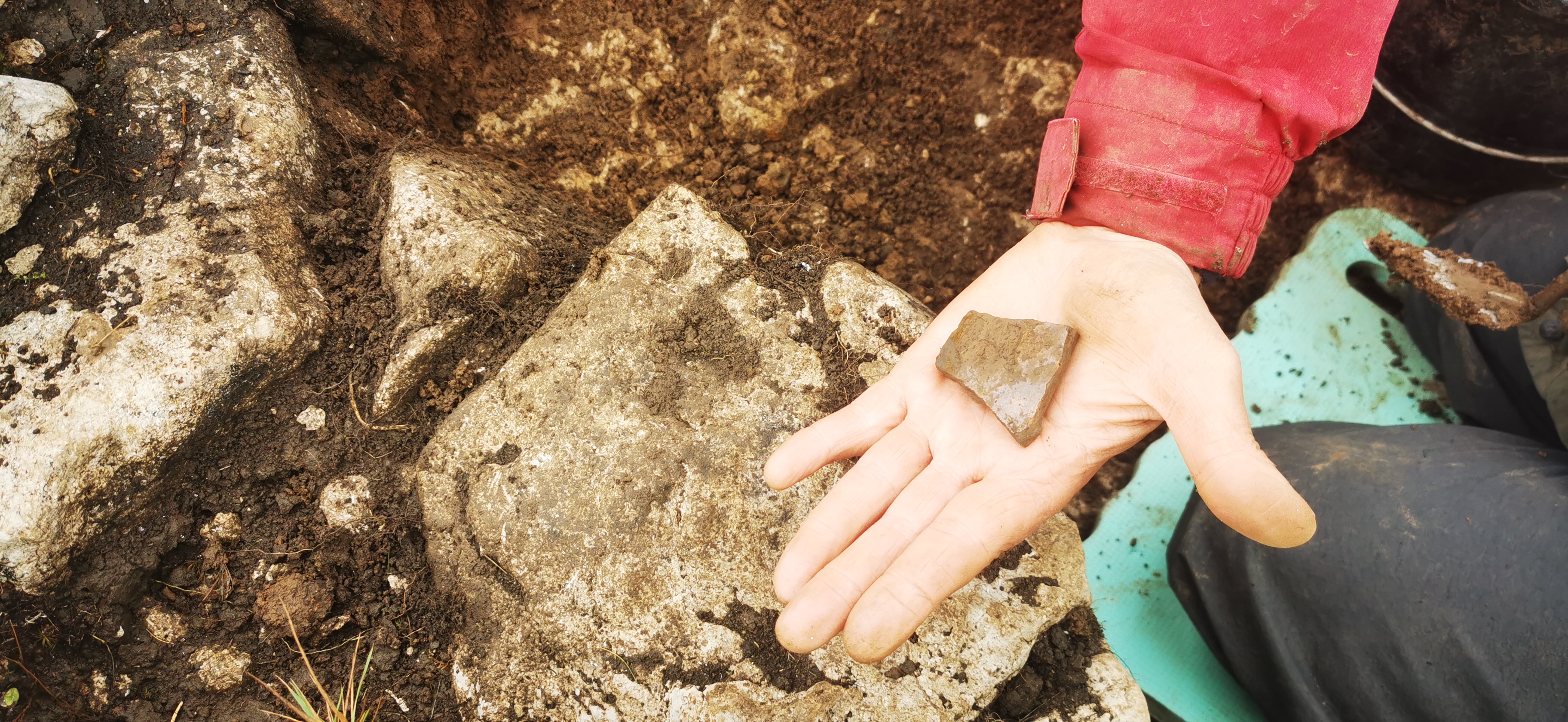Linda and Jan were working in Trench A today on the area where the longhouse wall meets the enclosure wall. It was not long before they made a fantastic find of some glazed pottery that may be of medieval date. The fragment of pottery was located within the lower deposit between the longhouse wall and the enclosure wall which is perfect in regards of dating evidence.