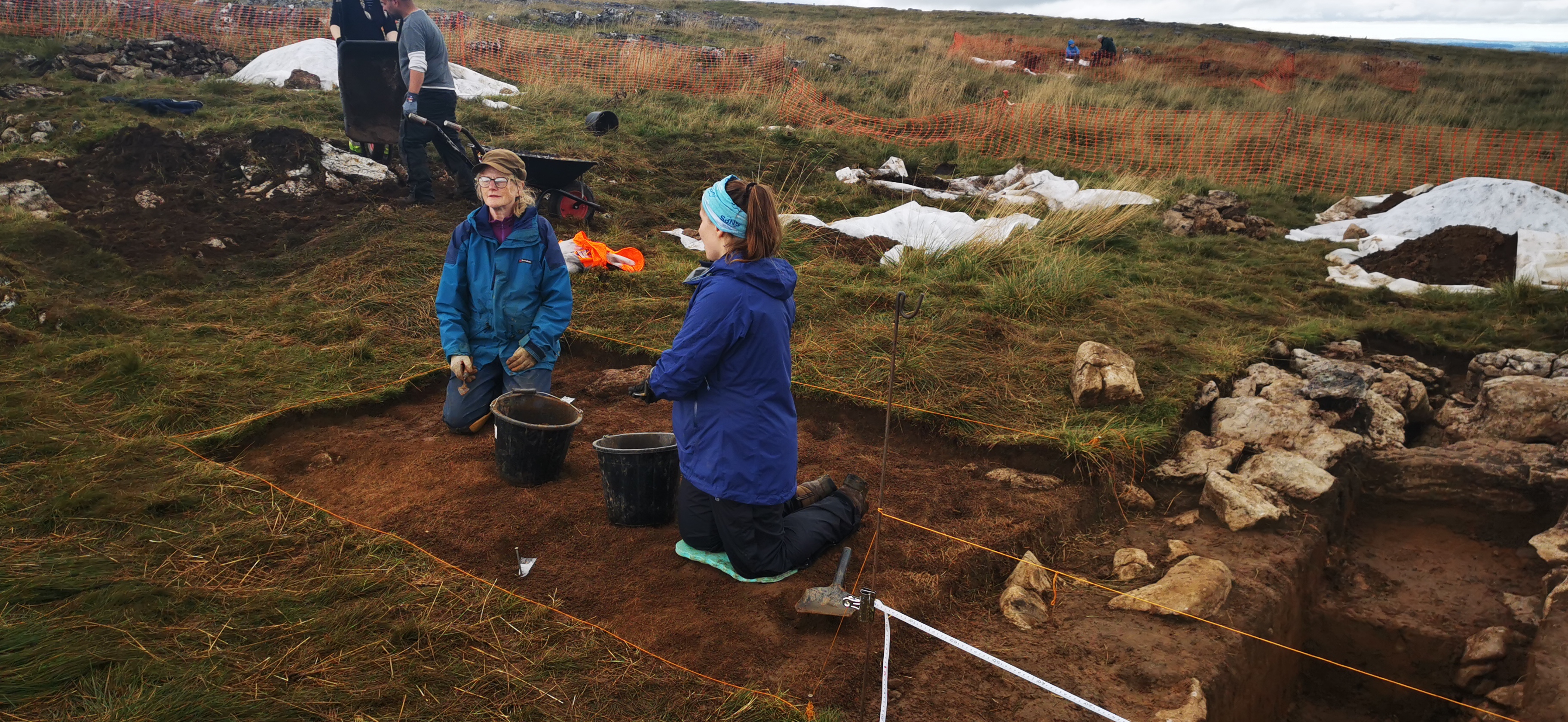 It was decided to extend Trench C to look further at the possible evidence of any surviving floor level within the north-eastern area of the longhouse. After the turf was removed in this new area, Hilary was set the task, with help from Hannah, to clean back and look for any change in deposits. It will be interesting to see what we discover over the next few days within this area.