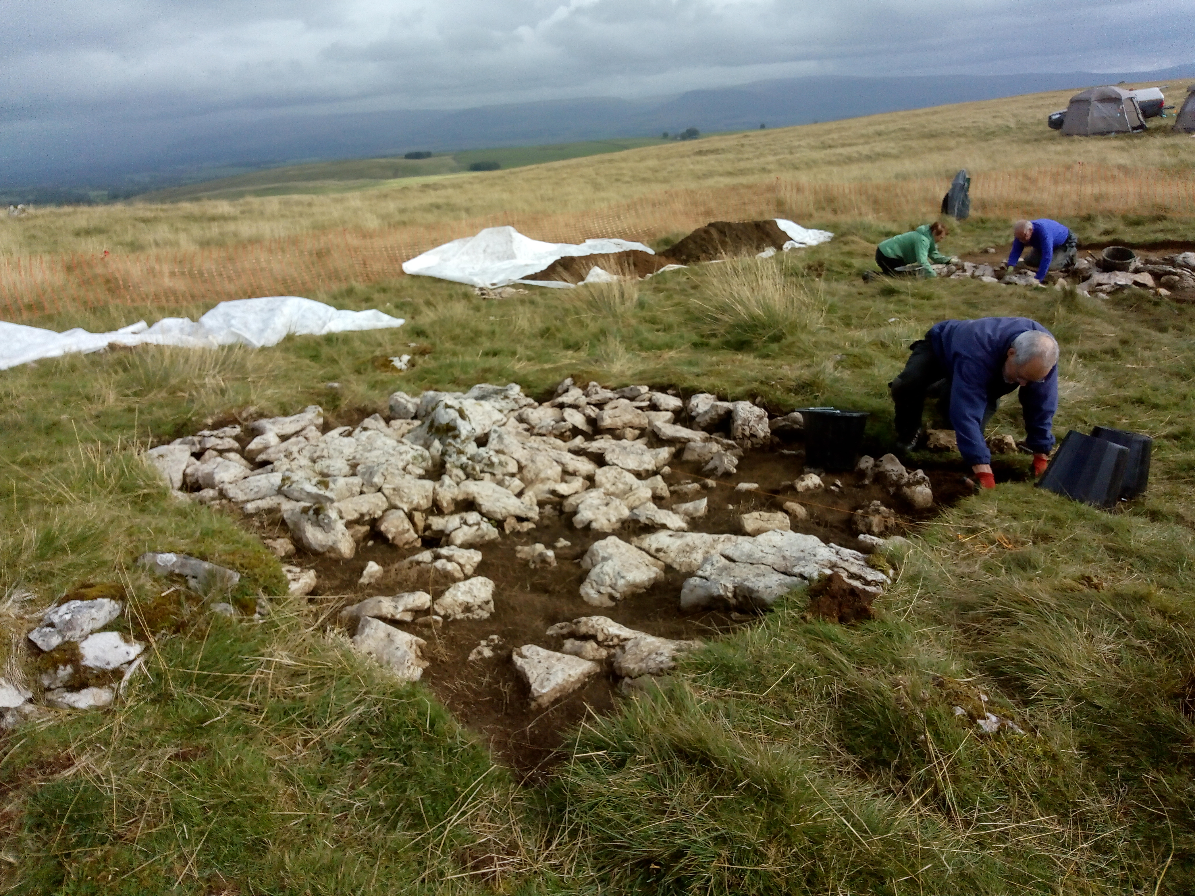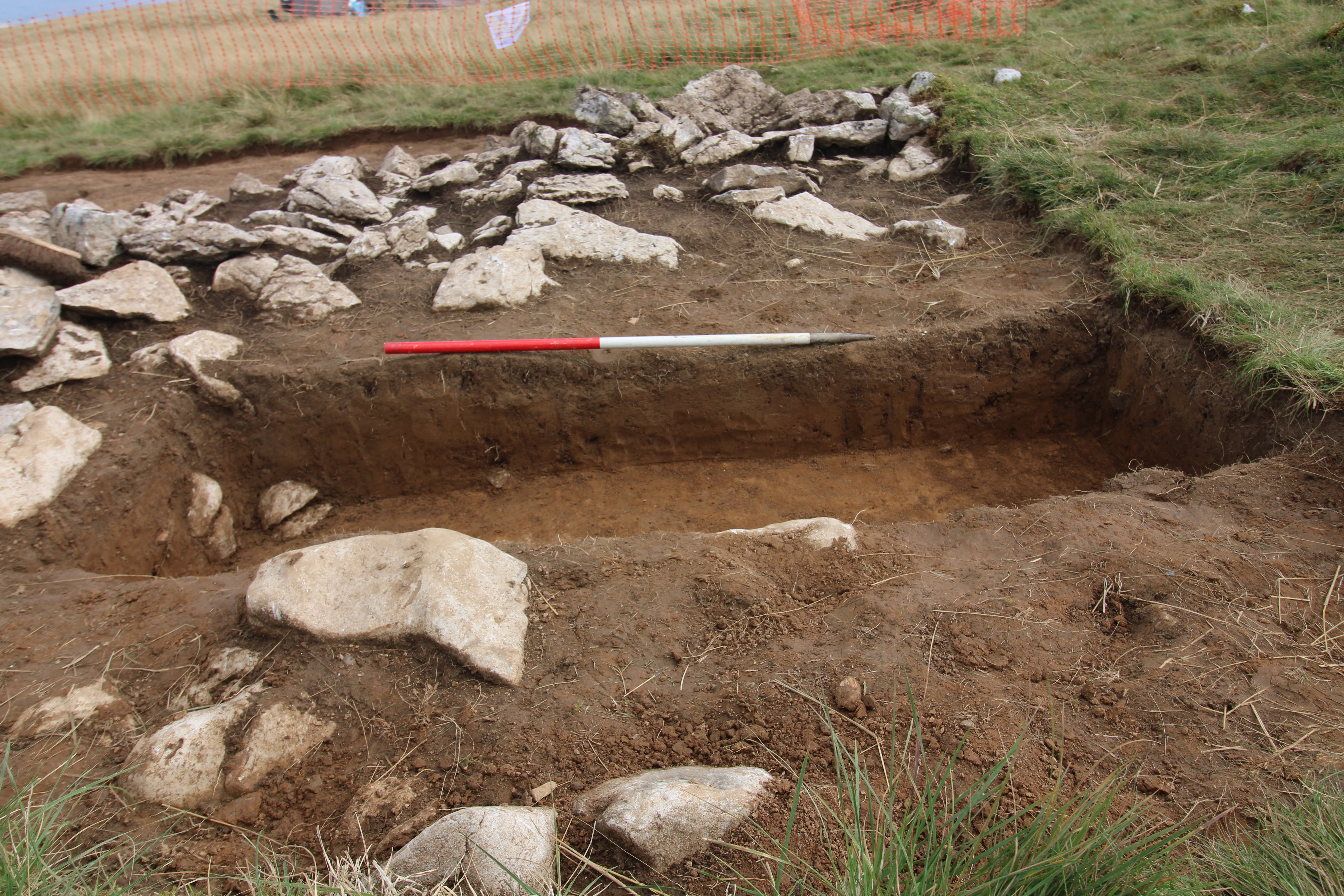 Linda, now joined by Jan, Jane and Bob began removing the rubble collapse within Trench A to expose the remainder of the south-western wall of the longhouse. By the afternoon the rubble had been removed down to the bedrock, unfortunately with no clear evidence for a floor surface. However samples were taken from the deposits beneath the rubble and with luck environmental processing might yet provide us with material by which to date the building.