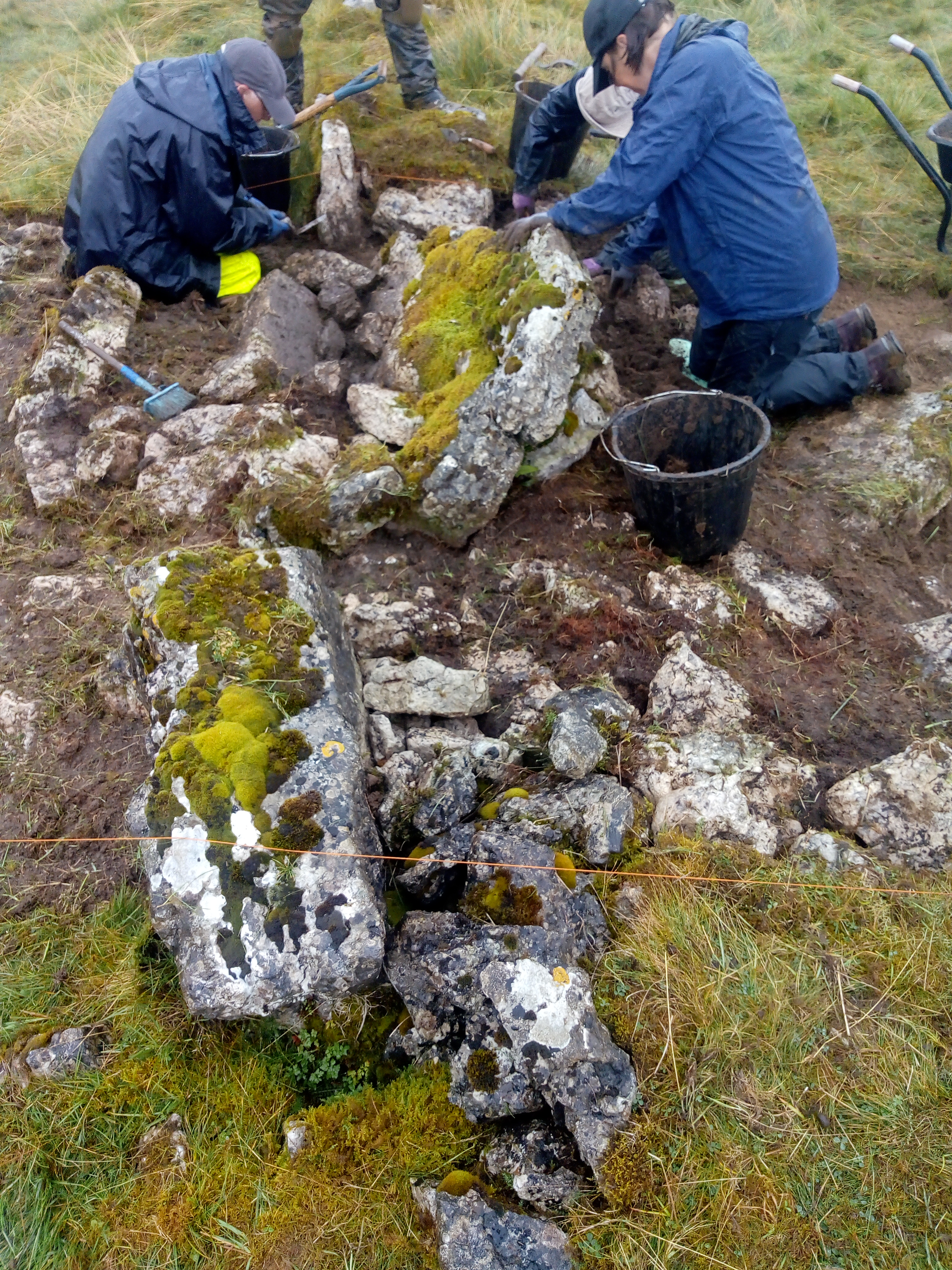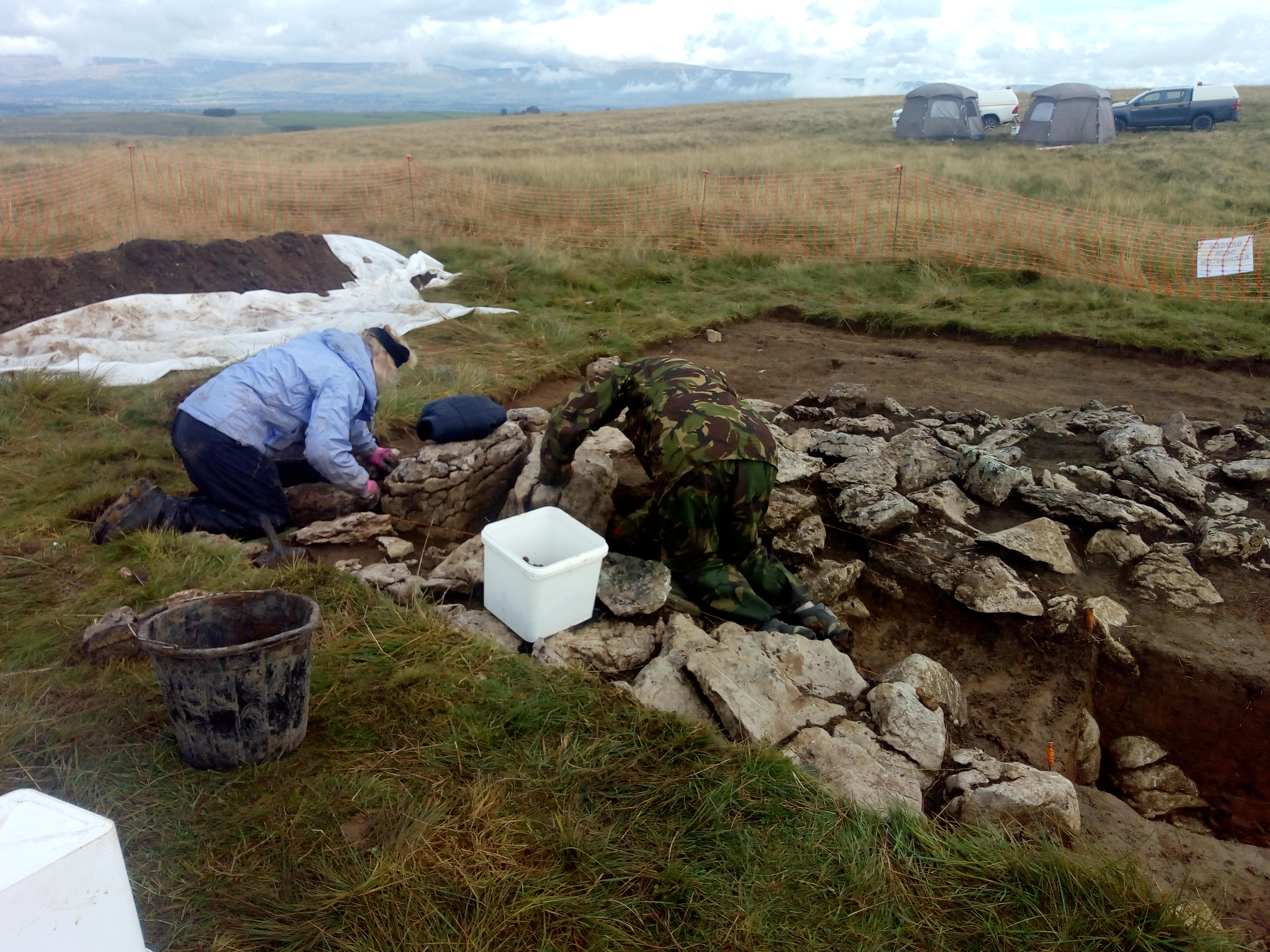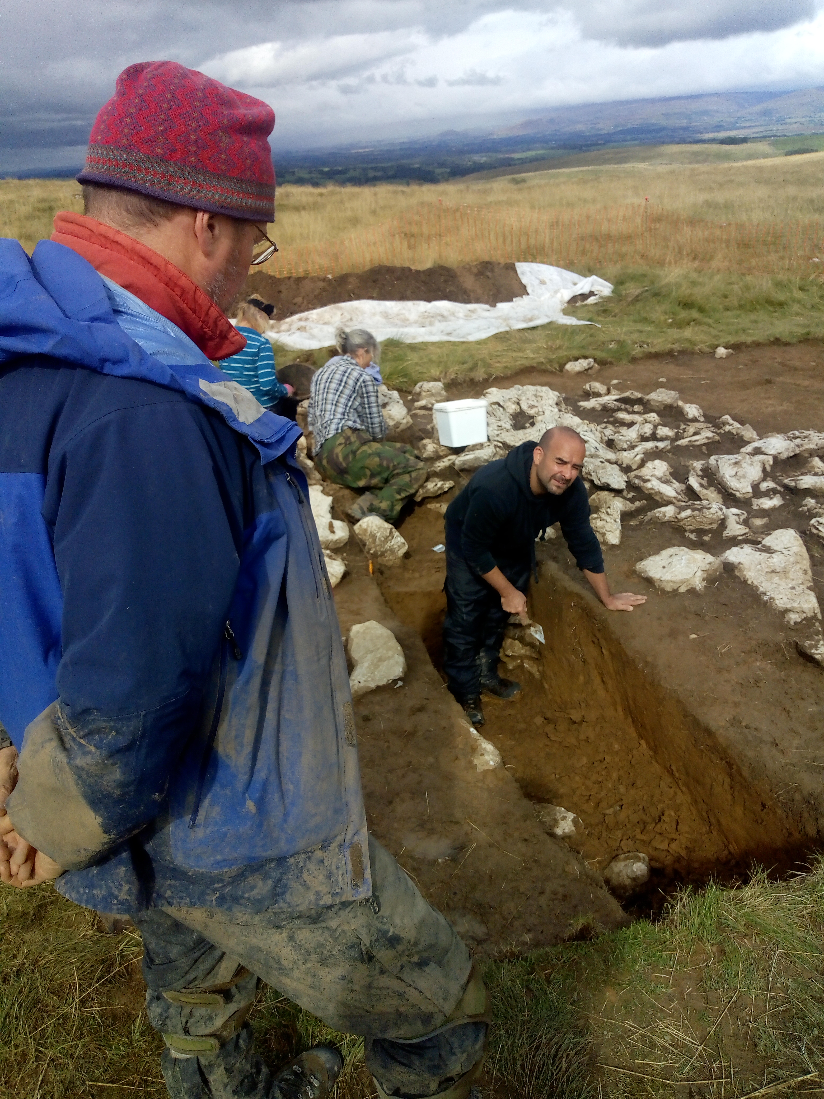 As you may have noticed from some of the photos being posted there are some quite incredible panoramic views from our site on Scar Grange. When the weather is right you can see for miles and after a wet start a drier period made us think perhaps the forecast had got it wrong today. At lunch we were treated to an impressive low rainbow from the north, but of course where there is a rainbow there must be rain and a persistent deluge eventually made us retreat to the tents and then down the hill.